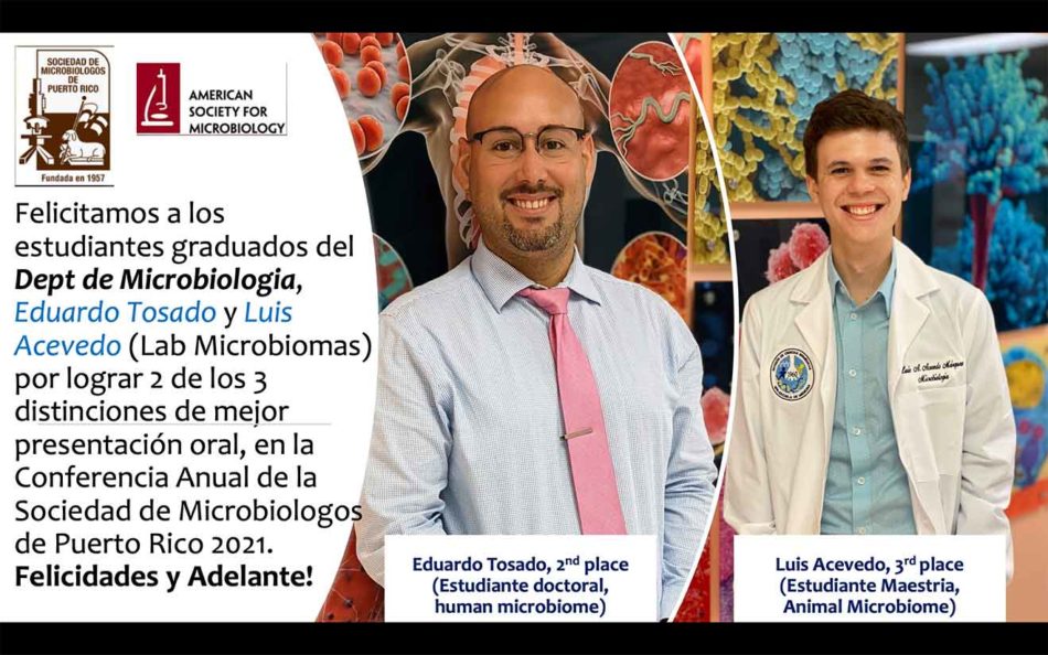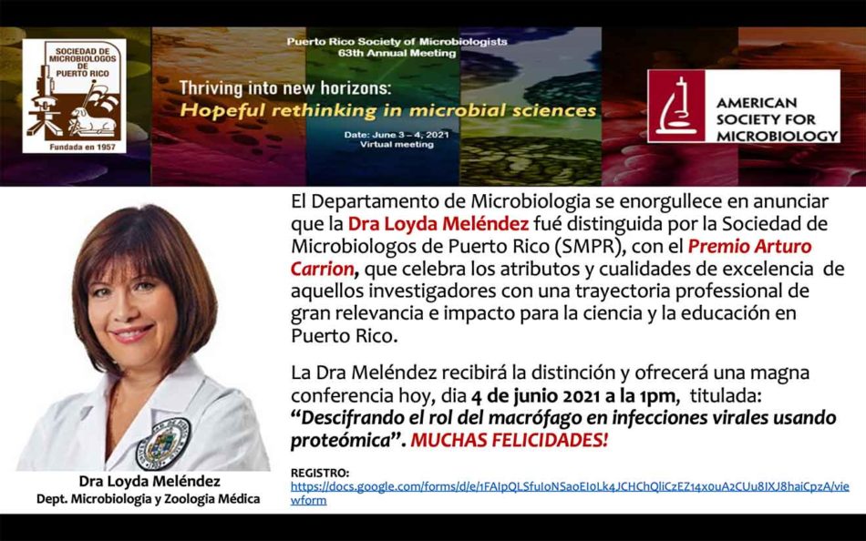 El Departamento de Microbiología se enorgullece en anunciar que la Dra Loyda Meléndez fue distinguida por la Sociedad de Microbiólogos de Puerto Rico (SMPR), con el Premio Arturo Carrión, que celebra los atributos y cualidades de excelencia  de aquellos investigadores con una trayectoria profesional de gran relevancia e impacto para la ciencia y la educación…