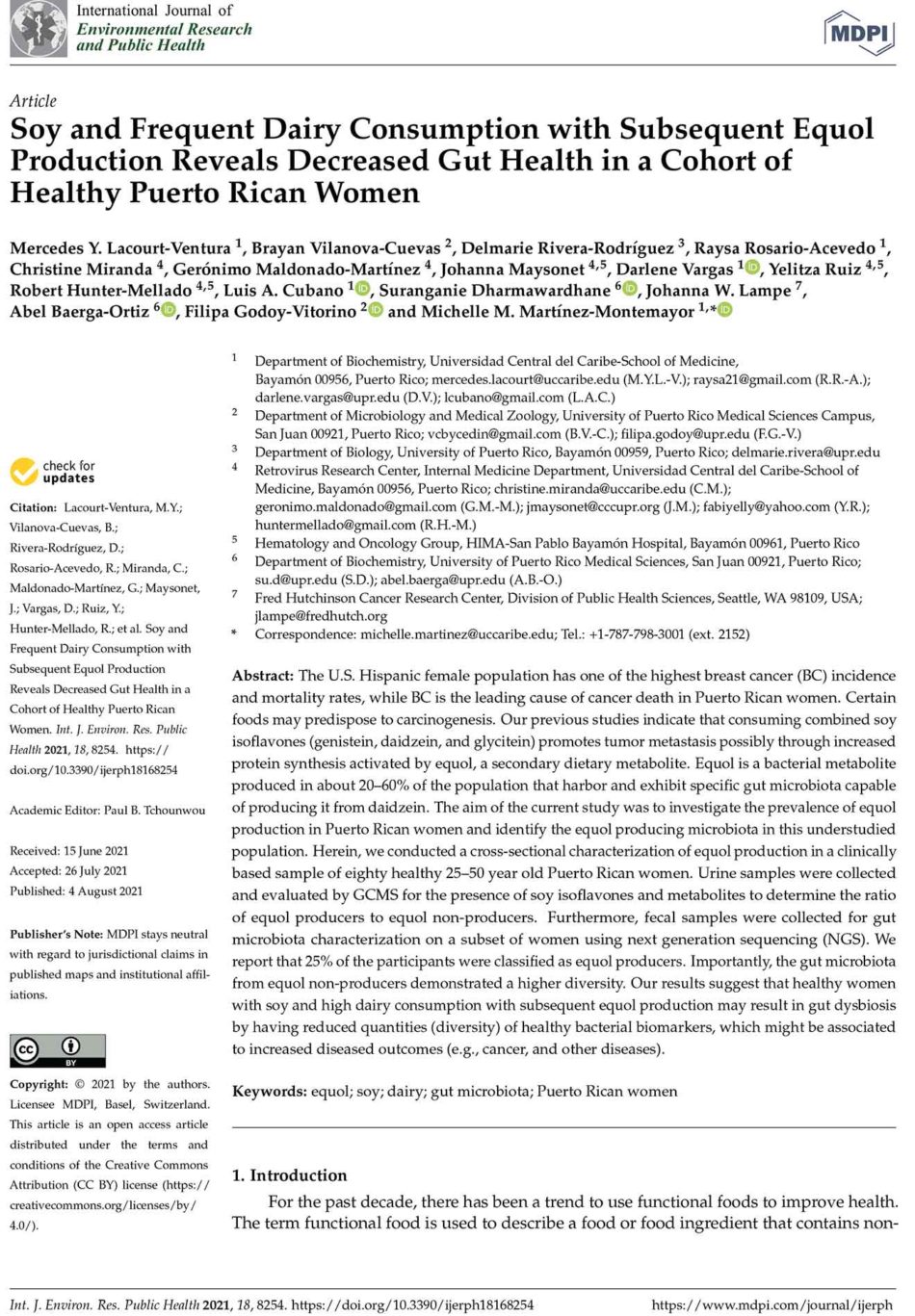 Soy and Frequent Dairy Consumption with Subsequent Equol Production Reveals Decreased Gut Health in a Cohort of Healthy Puerto Rican Women